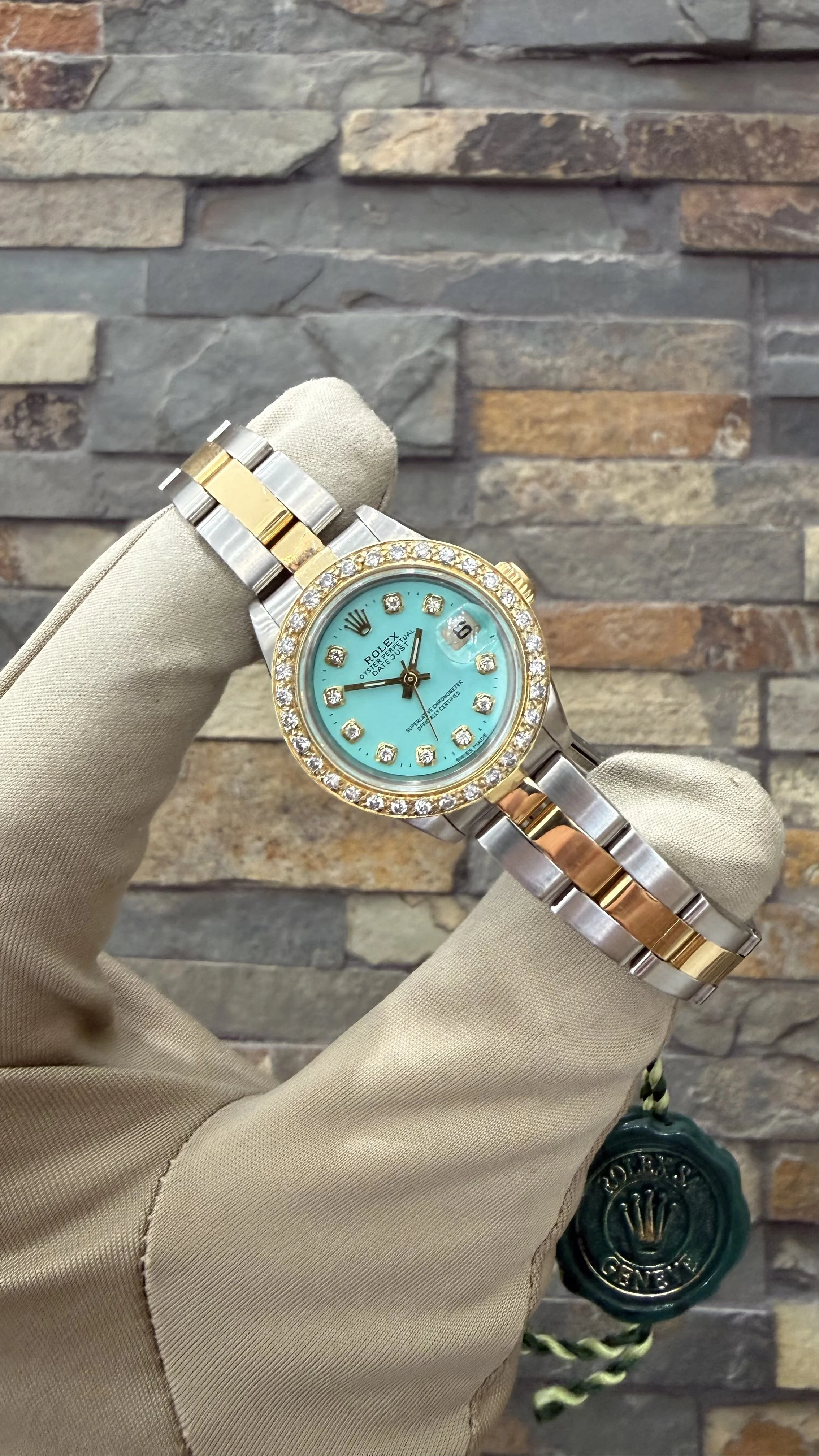 2000 Rolex 26mm Custom Ladies Tifffany Dial and Diamond Bezel REF #79163 with a box. Call or stop by the shop