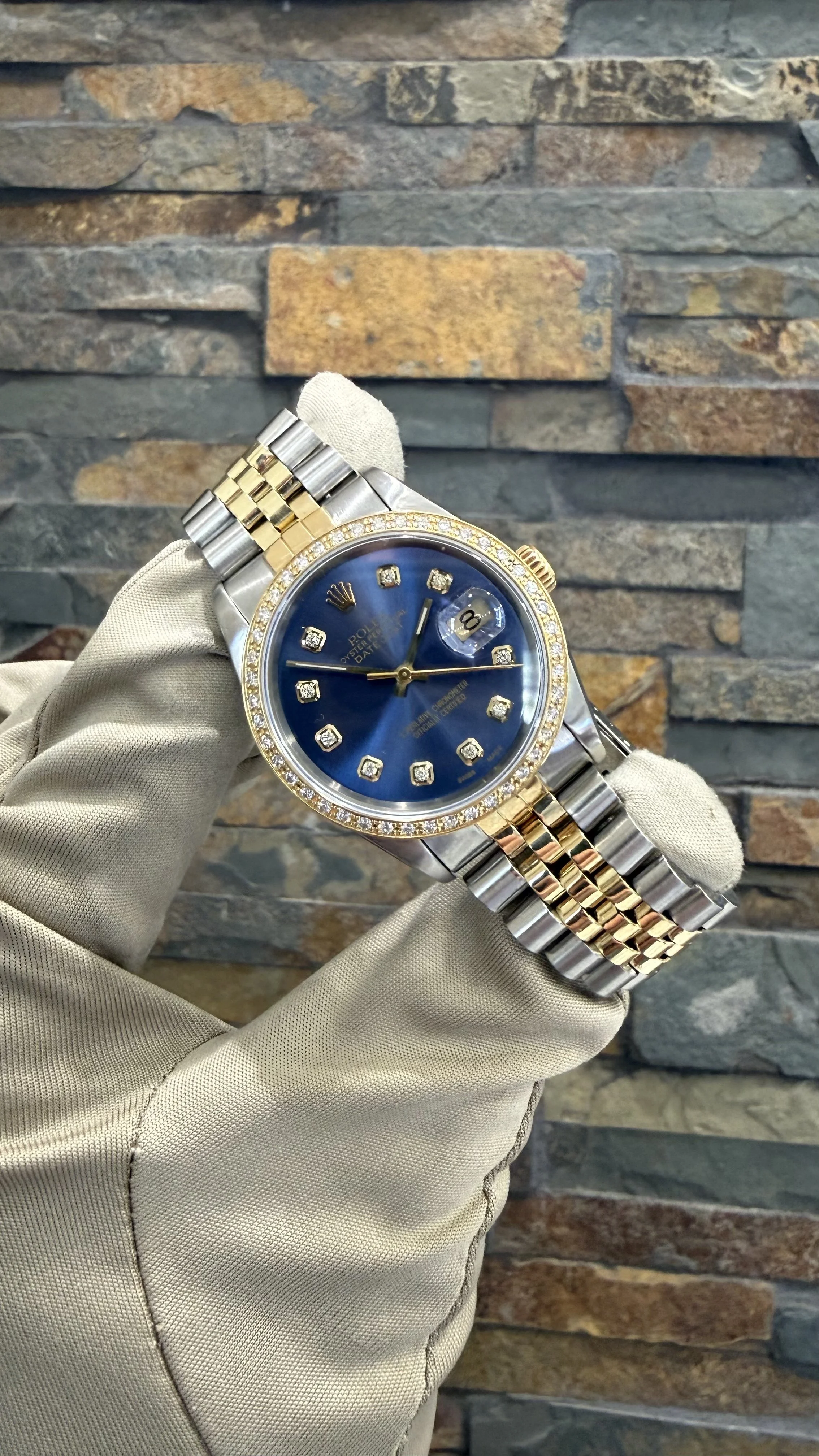 1990 Custom Rolex Navy Blue Diamond Dial DJ36 REF #16233 with a box. Call or stop by our shop