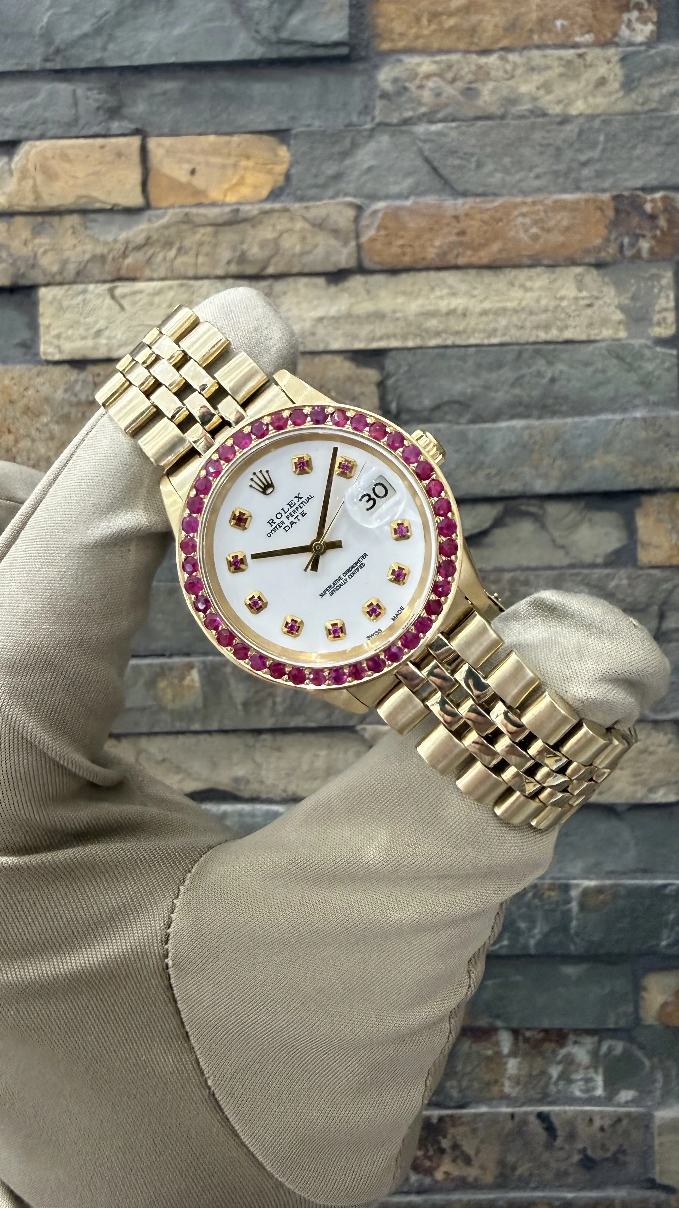 Custom Rolex Ruby Bezel and White Dial Date REF #1503 with a box. Call or stop by our shop